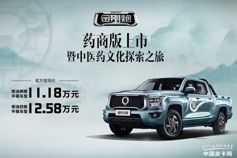 2022年6月13日,长城皮卡旗下金刚炮药商版正式上市。新车搭载2.0T柴油发动机,分为两驱和四驱共2款车型,售价区间为11.18-12.58万元。上市同时,金刚炮还为首批车主交付了车钥匙,并且发起了金刚炮中医药行业助商行动,成立中医药文化自媒体联盟,还开启了中医药文化探索之旅,全面推动中医药文化的传承与创新发展。