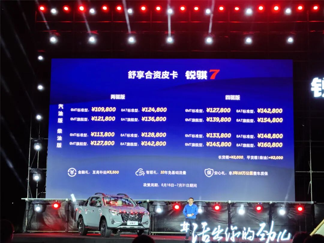 其他配置方面,锐骐7部分车型还将有自动空调、后排空调、仿皮座椅、无钥匙进入+一键启动、天窗、ESC、电子手刹、自动驻车、胎压监测、自动大灯等等,非常乘用化。