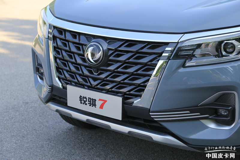 锐骐7是郑州日产旗下又一款全新车型,与纳瓦拉同平台打造,所以整体看上去与其十分接近。前脸部分采用了更加柔和的线条风格,尤其是发动机舱盖,看上去非常饱满。倒梯形中网两侧带有镀铬装饰,下方一直延伸到保险杠中部,提升前脸的气势。两侧大灯内部设计很时尚,与中网连通的部分带有十分细致的倒角,增加精致的感觉。保险杠两侧雾灯区域带有外扩的设计,与官方宣传的“虎啸山林”形象非常吻合。