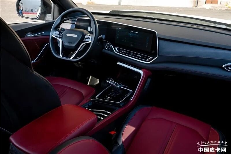 新车的内部精致与时尚并存,看上去让人赏心悦目。真皮多功能方向盘功能丰富,仪表盘和中控屏也采用了时下流行的双大屏设计,所有车内的设计都不会让你觉得这是台皮卡。屏幕下方的大尺寸按键功能十分清晰,也方便盲操作。四驱车型的驱动模式切换按键也在此功能区。金刚炮的配置也相当丰富,仿皮座椅、后排空调出风口、前后共3个USB插口、电子手刹、上坡辅助、倒车影像+雷达、胎压监测、蓝牙电话、导航、车联网、语音识别等等。