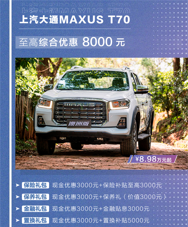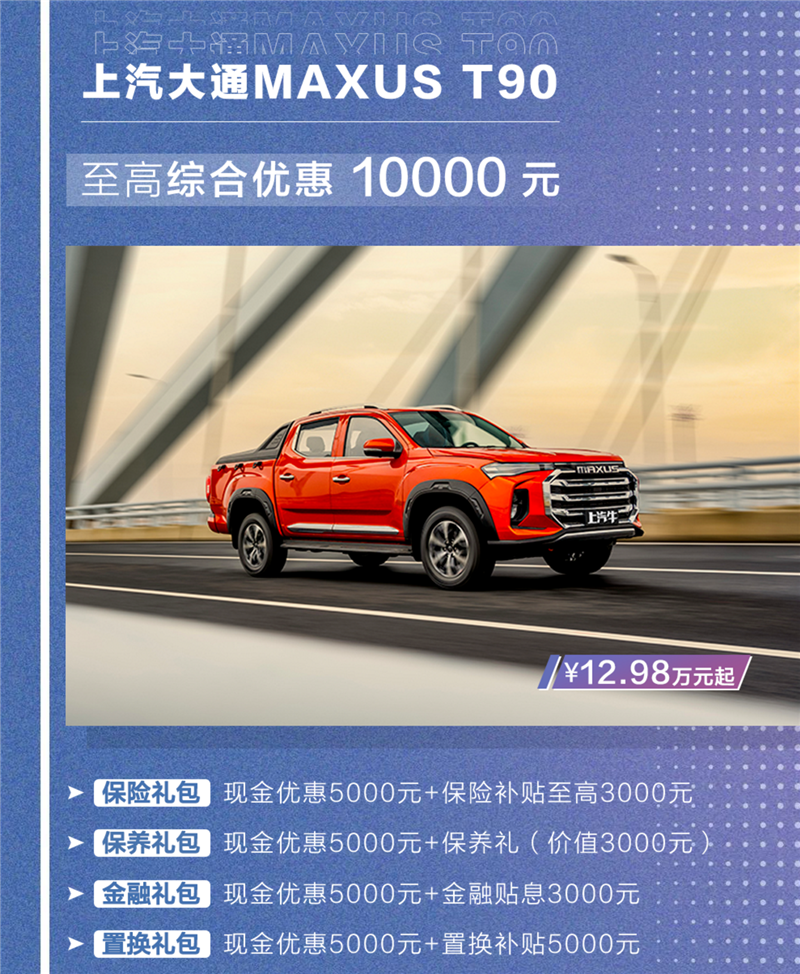 上汽大通多款车型开启夏日购车狂欢季,购买上汽大通MAXUS T70、T90皮卡,可有保险礼包、保养礼包、金融礼包、置换礼包四种套餐可选(不同享,四选一),上汽大通除了提供实打实的现金优惠外,还提供保险补贴、保养礼包等福利。其中,T70至高优惠8000元,T90至高优惠1万元。