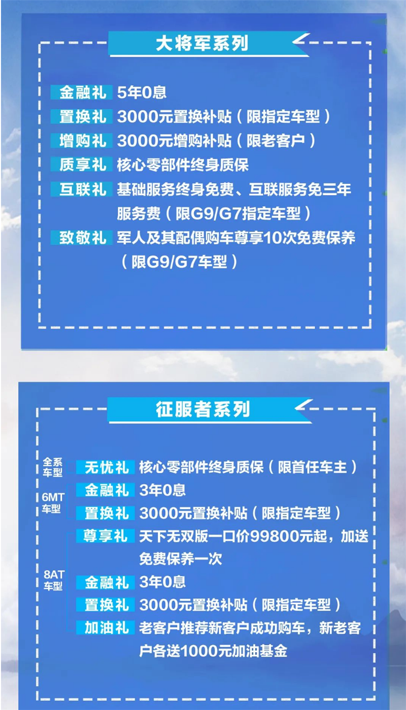 7月1日-8月31日,购买福田皮卡大将军、征服者系列均可享受“3000元置换补贴”、“3000元增购补贴”、“核心零部件终身质保”等优惠,部分车型还推出“一口价”。此外,在红色七月,福田还针对军人家庭推出致敬礼。