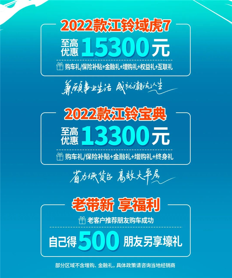 7月伊始,江铃皮卡推出宠粉钜惠,购买2022款域虎7或2022款宝典可享购车礼、金融礼、增购礼等多重优惠。其中,域虎7至高优惠达1.53万元,宝典至高优惠达1.33万元。