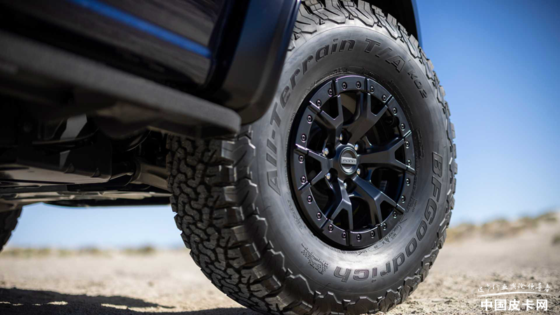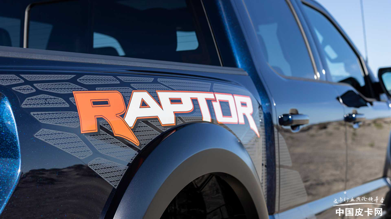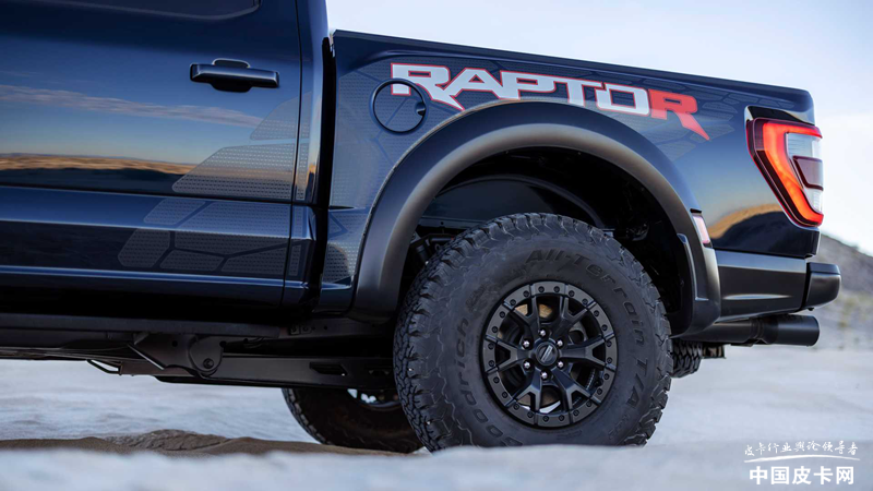 车身侧面和尾部的变化更小,车身带有独特的拉花,仔细看拉花内部的纹路为V8字样,并且RAPTOR的首个R或者是最后的R被标成了红色,生怕别人不知道这是一台猛禽R。轮胎部分采用37英寸的百路驰KO2全地形轮胎,同样配置在V6猛禽上是可选的项目。