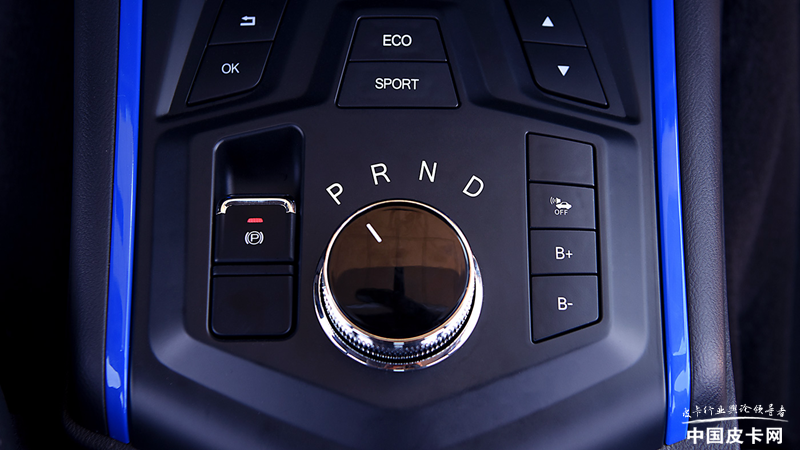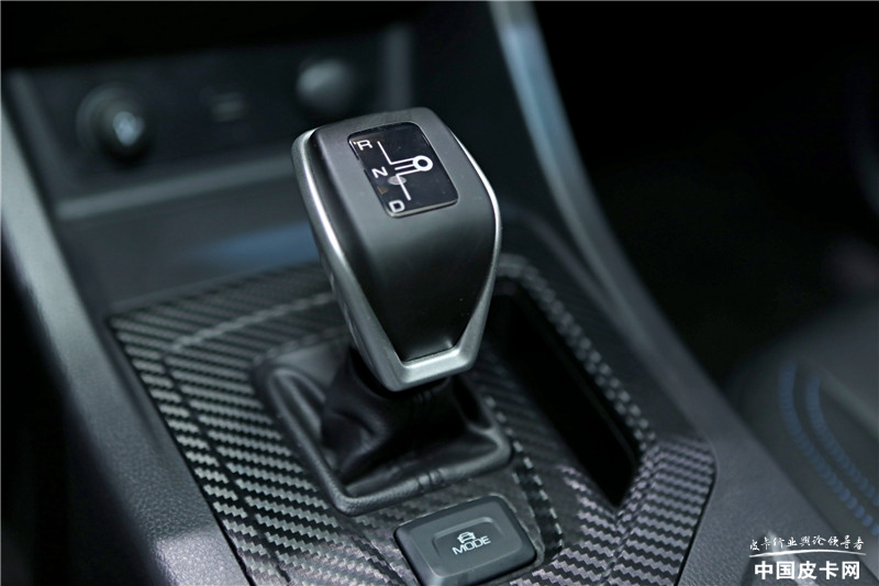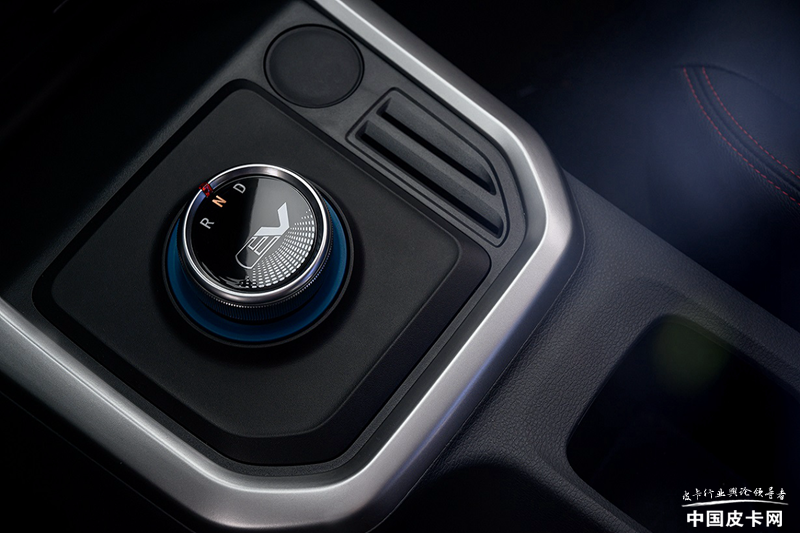 锐骐6 EV在外观及内饰设计上与燃油版车型保持一致,仅在细节处有所升级。其中,车头部分采用了六边形进气格栅设计,内部配有蓝色元素进行装饰,格栅右下方还镶嵌了“EV”专属标识,以及前保险杠左右两侧雾灯处的蓝色元素装饰条,均彰显了该车新能源皮卡的身份。车辆内部也脱胎自燃油版,但是在细节处增加了蓝色饰条装饰,突显纯电动车型身份。重要的是新车换挡机构采用了旋钮式换挡,进一步提升消费者的操作质感。