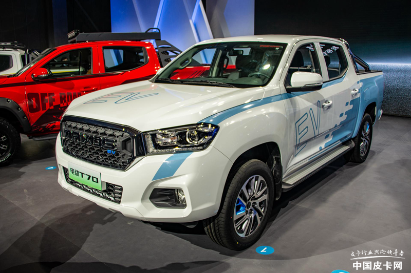 T70电动版基本延续了燃油版车型的外观设计,车身多处有蓝色的EV标识,并且取消了车顶行李架。动力部分,T70电动版采用了电驱桥“三合一”集成化设计。电机功率高达130kW,峰值扭矩310N·m。而电池部分则使用了一体式充配电单元,同时具备快充和慢充功能,快充36分钟可至80%电量。