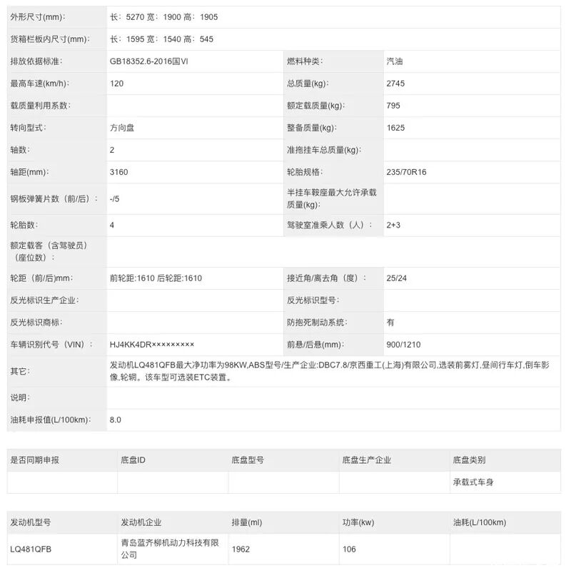 其余申报信息来看,该车轮胎尺寸为235/70R16,长货箱版额定载质量为795公斤,标准货厢额定载质量495公斤。