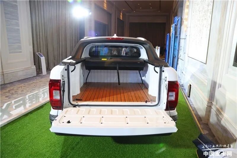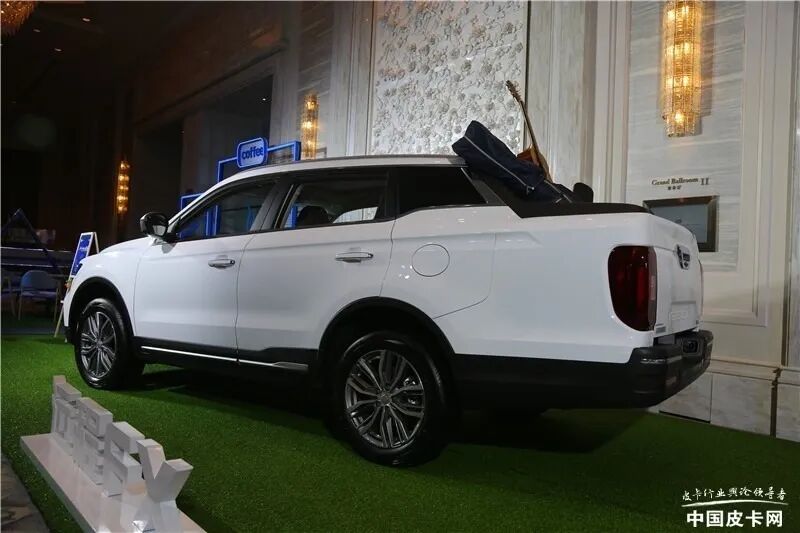 该车标配LED日间行车灯、全景天窗、后视镜电加热、阻尼后货箱尾门、无钥匙进入、一键启动、前排座椅加热、卷帘式后货箱盖、7英寸液晶仪表盘、12.3英寸中控屏、多功能方向盘、ABS、车身稳定控制系统、紧急制动提醒、全速自适应巡航、360°随动3D影像等等,与SUV持平。动力上搭载代号为JLE-4G18TDC的1.8T汽油发动机,最大功率135kW,最大扭矩300N·m,匹配7速双离合变速箱。