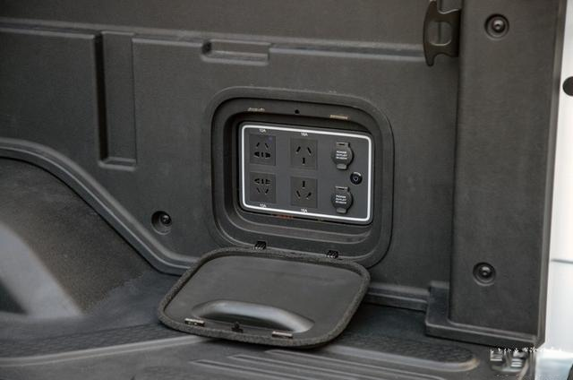 雷达RD6在设计风格上秉承了电动化删繁就简的理念,封闭式格栅、贯穿式前后大灯组等融入了诸多时下电动车的标志性设计;货厢门采用了电控锁止方式,通过钥匙或者车内的按键解锁才能开启,内部设有耐磨涂料,还配置了多功能放电面板,支持16A、10A,三孔、双孔、12伏接口,多种规格即插即用,可以满足用户在户外生活时对一些电器供电。