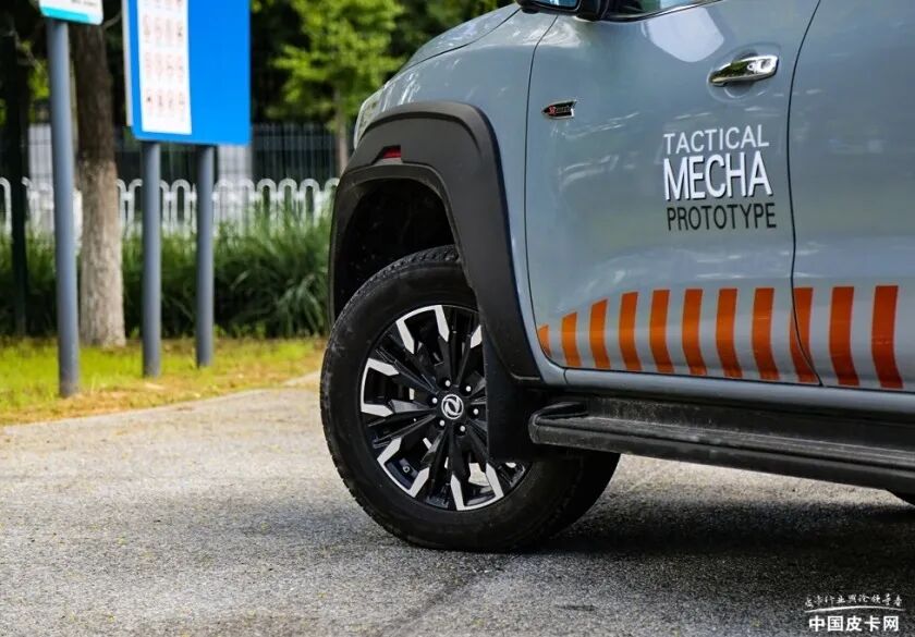来到车身侧面,运动版车型增加了较多运动风元素,如SPORT标识、橙色拉花、黑色轮眉以及反光装饰等。车辆的侧踏板、行李架以及防滚架依旧留存,不过样式进行了调整。车身尺寸方面,运动版车型整车长宽高分别为5320*1932*1857mm,轴距3150mm。轮胎选用的是尺寸为255/60R18的三角牌轮胎,轮圈样式有所调整,内搭橙色卡钳。