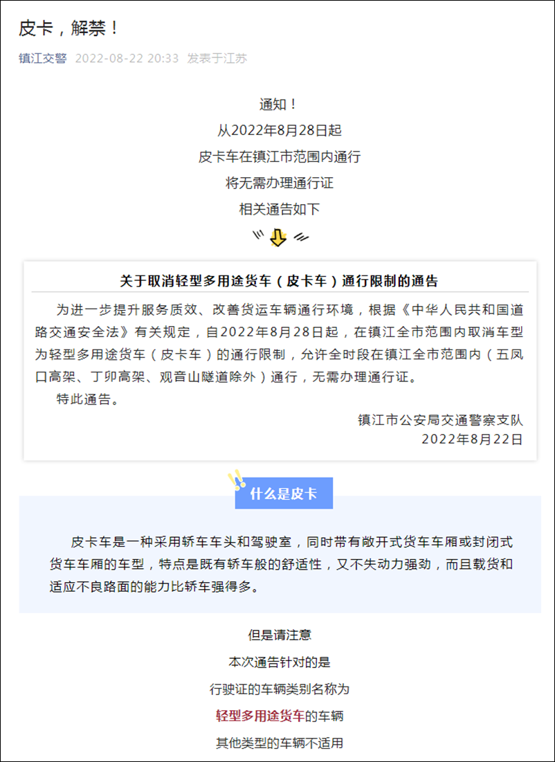 近日,镇江交警发布《关于取消轻型多用途货车(皮卡车)通行限制的通告》称,自2022年8月28日起,在镇江全市范围内取消车型为轻型多用途货车(皮卡车)的通行限制,允许全时段在镇江全市范围内(五凤口高架、丁卯高架、观音山隧道除外)通行,无需办理通行证。