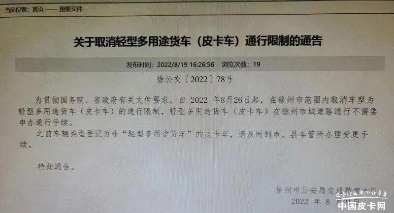 近日,中国皮卡网获得内部消息,徐州市公安局发布了《关于取消轻型多用途货车(皮卡车)通行限制的通告》,自2022年8月26日起,在徐州市范围内取消车型为多用途货车(皮卡车)的通行限制,皮卡车在徐州市域道路通行不需要申办通行手续。同时,车辆类型登记不是轻型多用途货车的皮卡车,可到车管所办理变更手续。