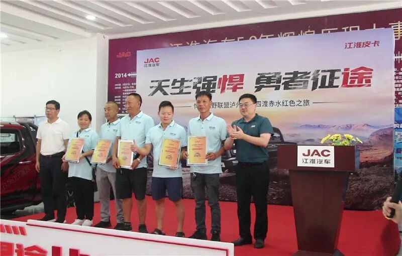 近日,悍途越野联盟泸州大队近40位用户和家人,在四川泸州集结,共赴四渡赤水红色之旅。江汽集团总经理李明、江汽集团皮卡公司副总经理赵涛、江汽集团皮卡公司党委副书记谢振兴、江淮皮卡营销公司总经理助理储昭庆、泸州三益汽贸有限公司总经理黄六贵出席发车仪式。
