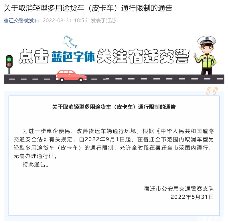 8月31日,江苏省宿迁市公安局交通警察支队发布通知,自2022年9月1日起,在宿迁全市范围内取消车型为轻型多用途货车(皮卡车)的通行限制,允许全时段在宿迁全市范围内通行,无需办理通行证。此前,宿迁当地蓝牌车进城均不限制,因此皮卡进城并无阻碍,此次宿迁交警发文,从官方层面再次明确皮卡解禁,皮卡可在宿迁城区畅行无阻。