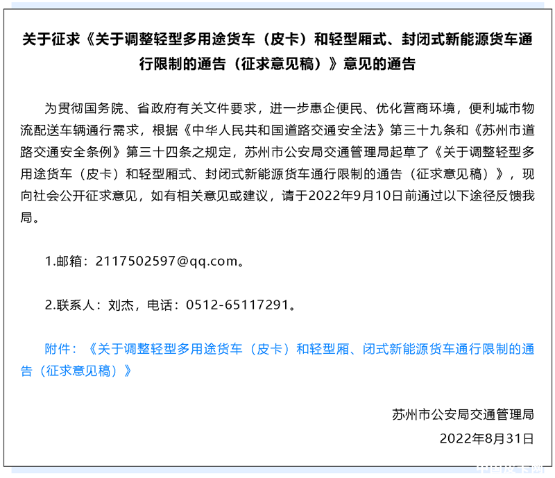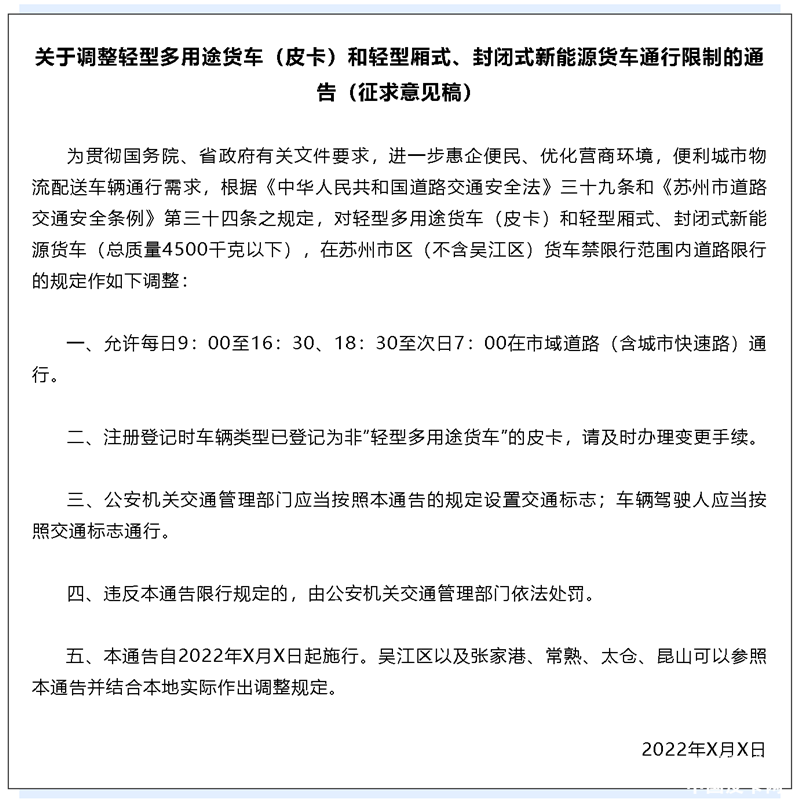 8月31日,苏州市公安局交通管理局发布关于征求《关于调整轻型多用途货车(皮卡)和轻型厢式、封闭式新能源货车通行限制的通告(征求意见稿)》意见的通告,对轻型多用途货车(皮卡)和轻型厢式、封闭式新能源货车(总质量4500千克以下),在苏州市区(不含吴江区)货车禁限行范围内道路限行的规定作做出调整,并面向社会公开征求意见。