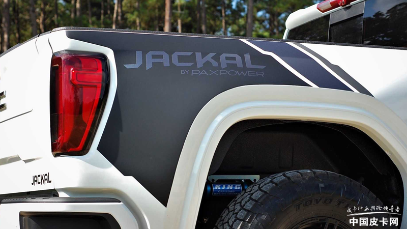 为了让车辆满足更高的越野需求,并且充分提升车辆的整体性能,PaxPower将GMC Sierra 1500的造型进行了重整和修饰。相比于普通版本GMC Sierra 1500的豪华和优雅,PaxPower版本车型更具野性气质,中网尺寸缩小后,车头更加紧凑,全新设计的保险杠上方加入了红色拖车钩。发动机舱盖的隆起以及更加宽大的后视镜,让车辆看起来更加霸气。当然,车身还加入了Jackal的拉花以及PaxPower的徽标。