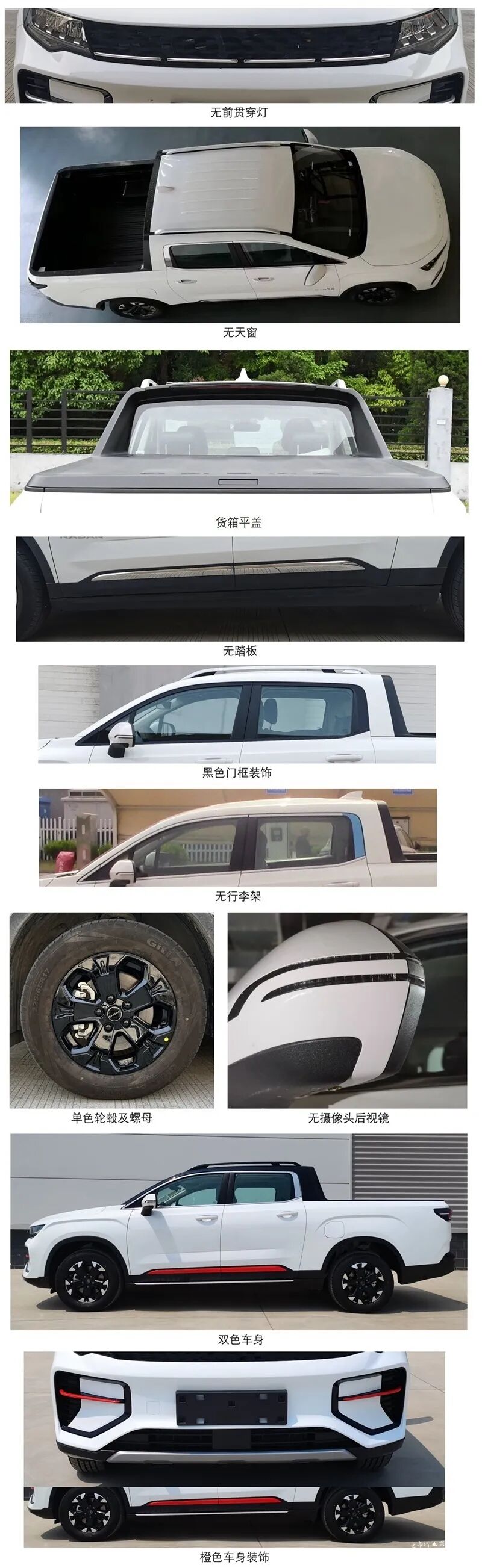 车身方面,雷达RD6将会有两种色彩搭配,包括一种黑白双色车身,并且还带有红色装饰条,整体风格非常年轻。在配置方面也会根据款式不同有所区别,例如贯穿式前灯、天窗、货箱盖、侧踏板、车顶行李架、轮毂等都是区分款式的配置。