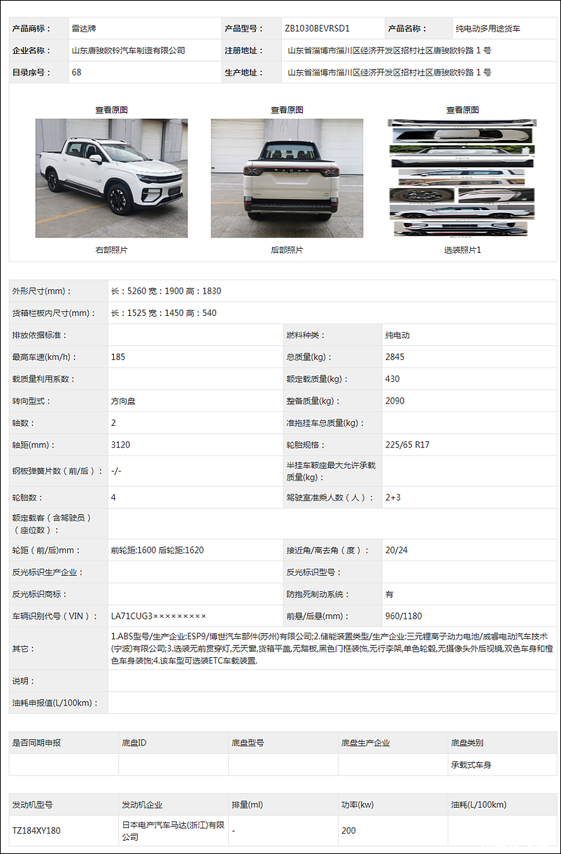 雷达RD6在最近也相当火爆,作为国内首款纯电平台打造的承载式皮卡,本身话题点就非常多。此次曝光的申报信息显示,该车只会推出一种车身尺寸,长宽高为5260*1900*1830mm,轴距3120mm,货箱尺寸1525*1450*540mm。虽然为承载式车身形式,但其额定载质量一点也不差,为430kg,保持在主流非承载中型皮卡的行列。