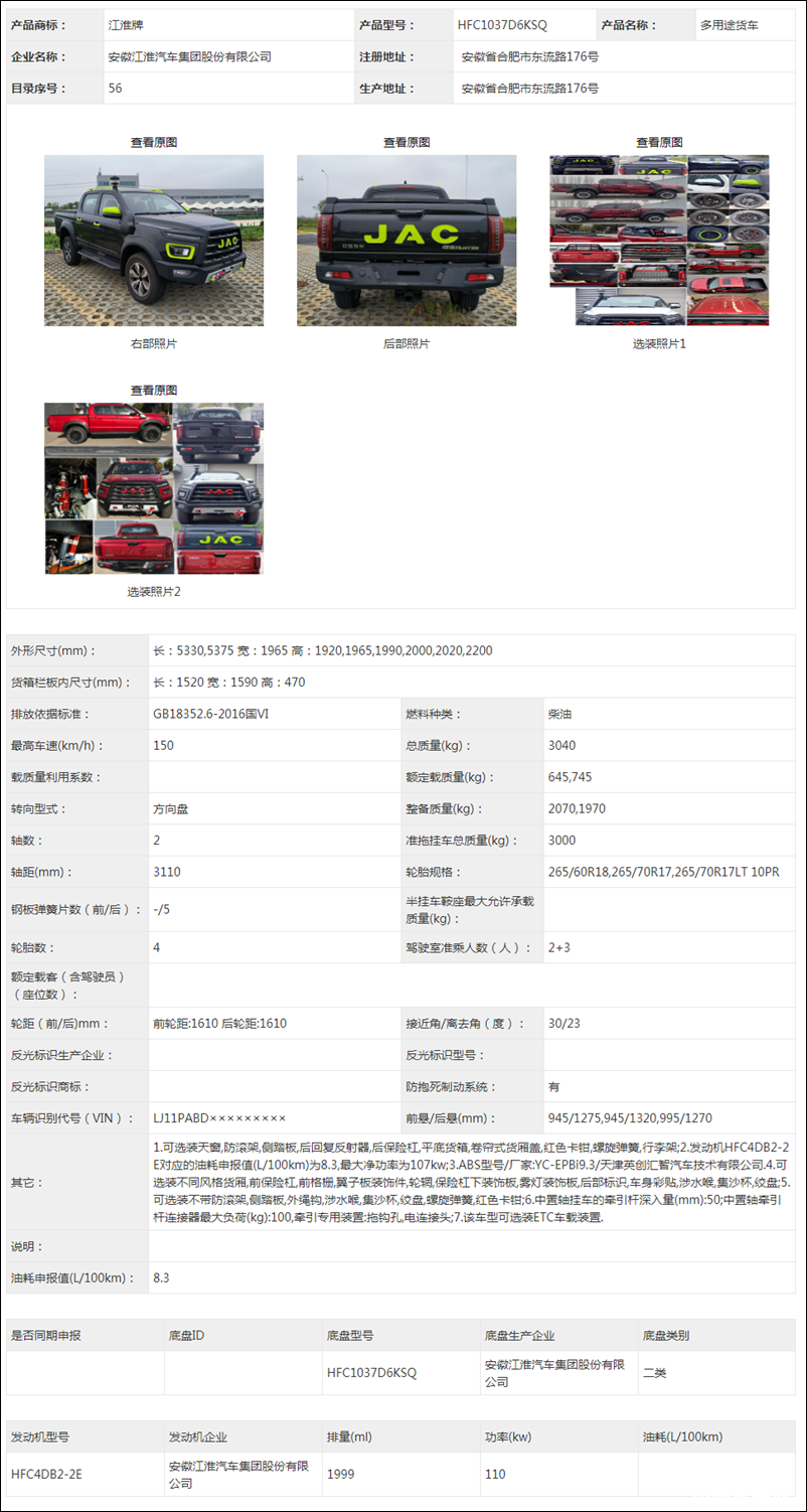 动力方面,本次申报车型均为柴油动力,搭载代号HFC4DB2的2.0T柴油发动机,最大功率110kW。
