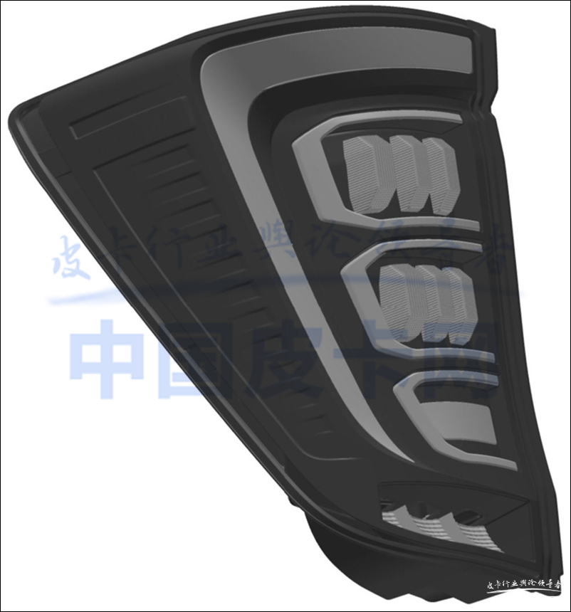 尾门灯是皮卡上少有的设计,而且与之前曝光的概念图基本保持一致。样式上来看,申报的专利图预计是半个尾门灯,而重汽这款皮卡采用对开尾门的设计,所以这样的设计比较合理。尾门灯中间较宽两侧逐渐收窄,预计点亮后会与前面常规的尾灯示宽灯连成一体,形成一个贯穿式的灯带样式。