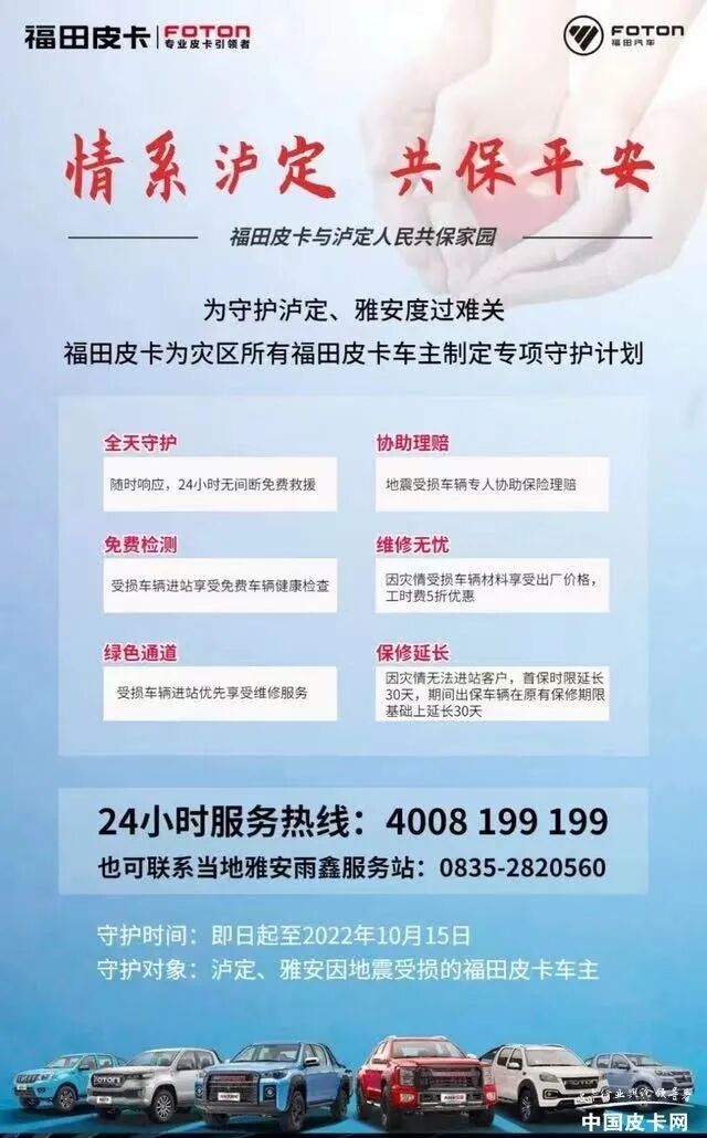 即日起至2022年10月15日,凡是因泸定、雅安地震受损的福田皮卡车主,可通过拨打福田皮卡24小时服务热线或联系当地福田皮卡服务站,可获得全天守护、协助理赔、免费检测、维修无忧、绿色通道、保修延长等无偿服务。