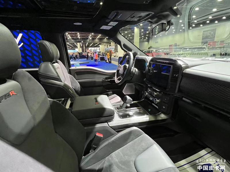 车辆内部同样采用宽大的布局方式,但在猛禽版的基础上加入了猛禽R的点缀,拥有黑色皮质、Alcantara和碳纤维材质装饰,提升性能和豪华感。可放倒的档杆、可翻折的工作台等亮点配置同样具备。