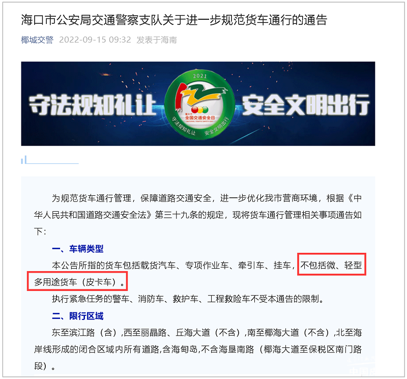 9月14日,海口市公安局交通警察支队发布《关于进一步规范货车通行的通告》,调整货车限行区域,并明确指出限行的车辆类型中不包括微、轻型多用途货车(皮卡车)。自去年3月重新收紧皮卡限行规定并大面积抓拍皮卡进城后,海口市终于将皮卡解禁的指针拨回,海南重新回到全省解禁的状态!
