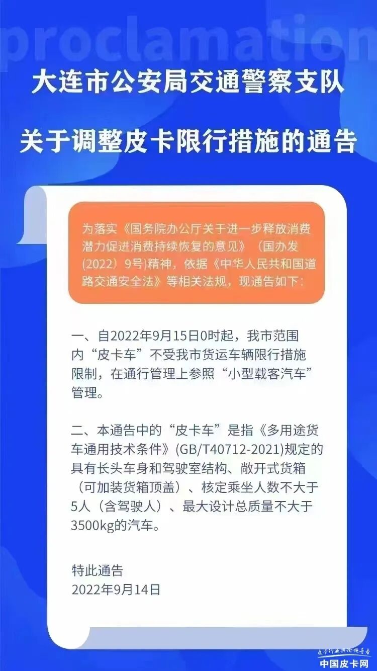 日前,大连市公安局交通警察支队发布最新消息,自2022年9月15日0时起,大连全市对皮卡全面放开通行限制,参照“小型载客汽车管理”。