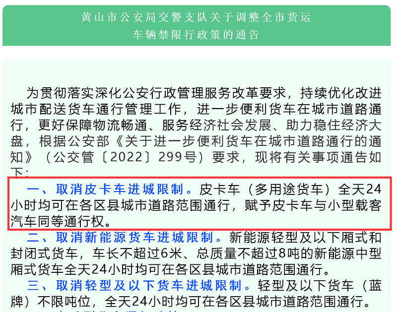 近日,安徽省六安市、池州市、黄山市等相继发文调整中心城区货运车辆禁限行措施,并提出全面取消皮卡车进城限制,皮卡车一律免办货车通行码,不受时间、路线限制,全天24小时均可在全市范围通行。此外,六安市、黄山市还同步取消了新能源货车进城限制,并对轻型及以下货车进城要求做了放宽。同时,宣城、安庆、宿州等市下辖多地也发文放开皮卡进城,继江苏、浙江大面积放开皮卡进城后,安徽也开始大力推进皮卡解禁的进度。
