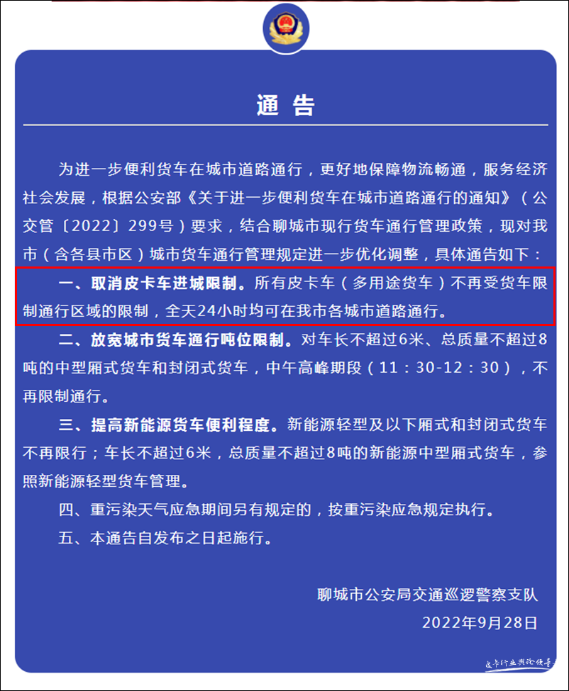 近日,山东聊城交警支队发布通告,对聊城现行货车通行管理政策进行优化调整,取消皮卡车(多用途货车)限制通行区域的限制,全天24小时均可在聊城各城市道路通行。
