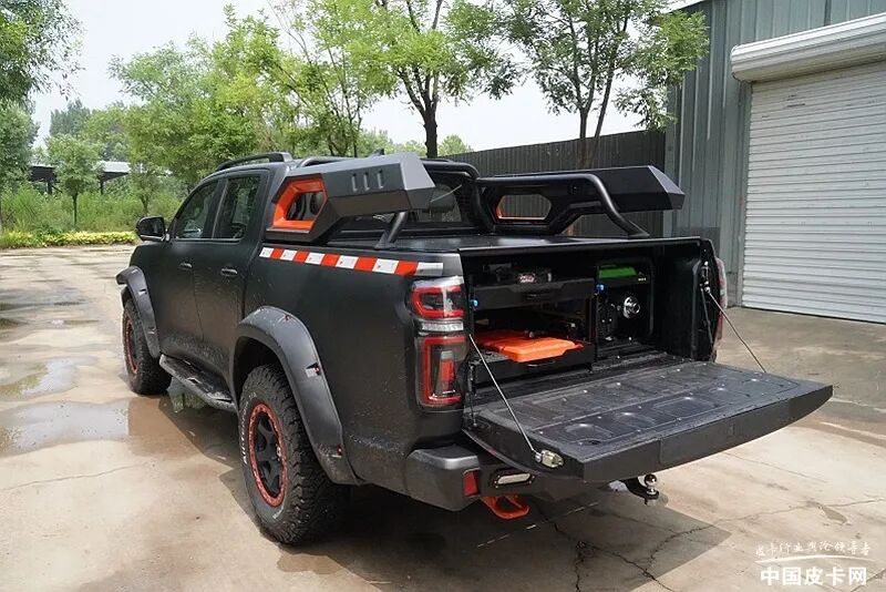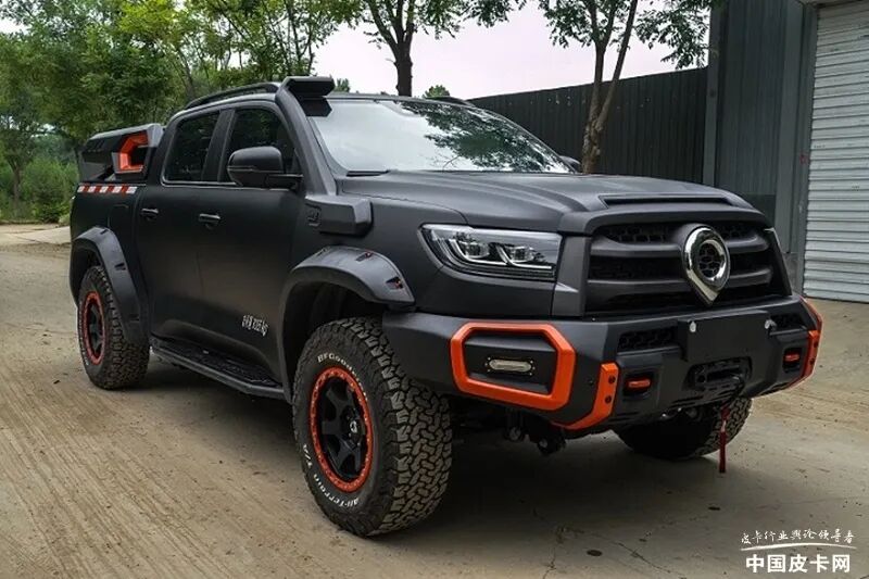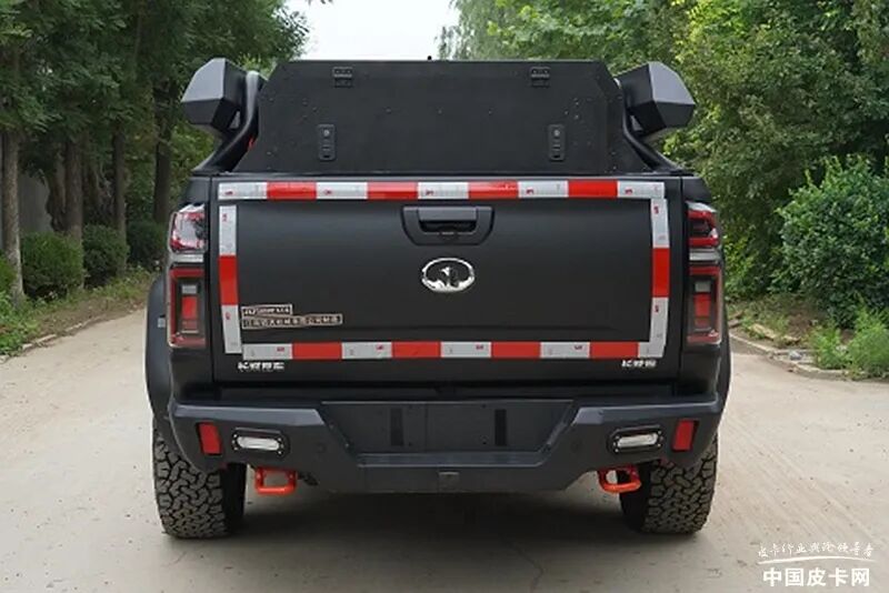 车身数据方面,该车尺寸长宽高为5513*2090*1902mm,轴距3230mm,准拖挂车总质量2.5吨,轮胎尺寸285/70R17,前后轮距1738mm,接近角/离去角为32/21度。动力方面,该车配备长城代号GW4C20B的2.0T汽油发动机,最大功率145kW。传动部分依然匹配8速自动变速箱,但齿比被重新调整,更适合越野。另外,原厂的适时四驱系统在黑弹上也被调整为分时四驱系统。