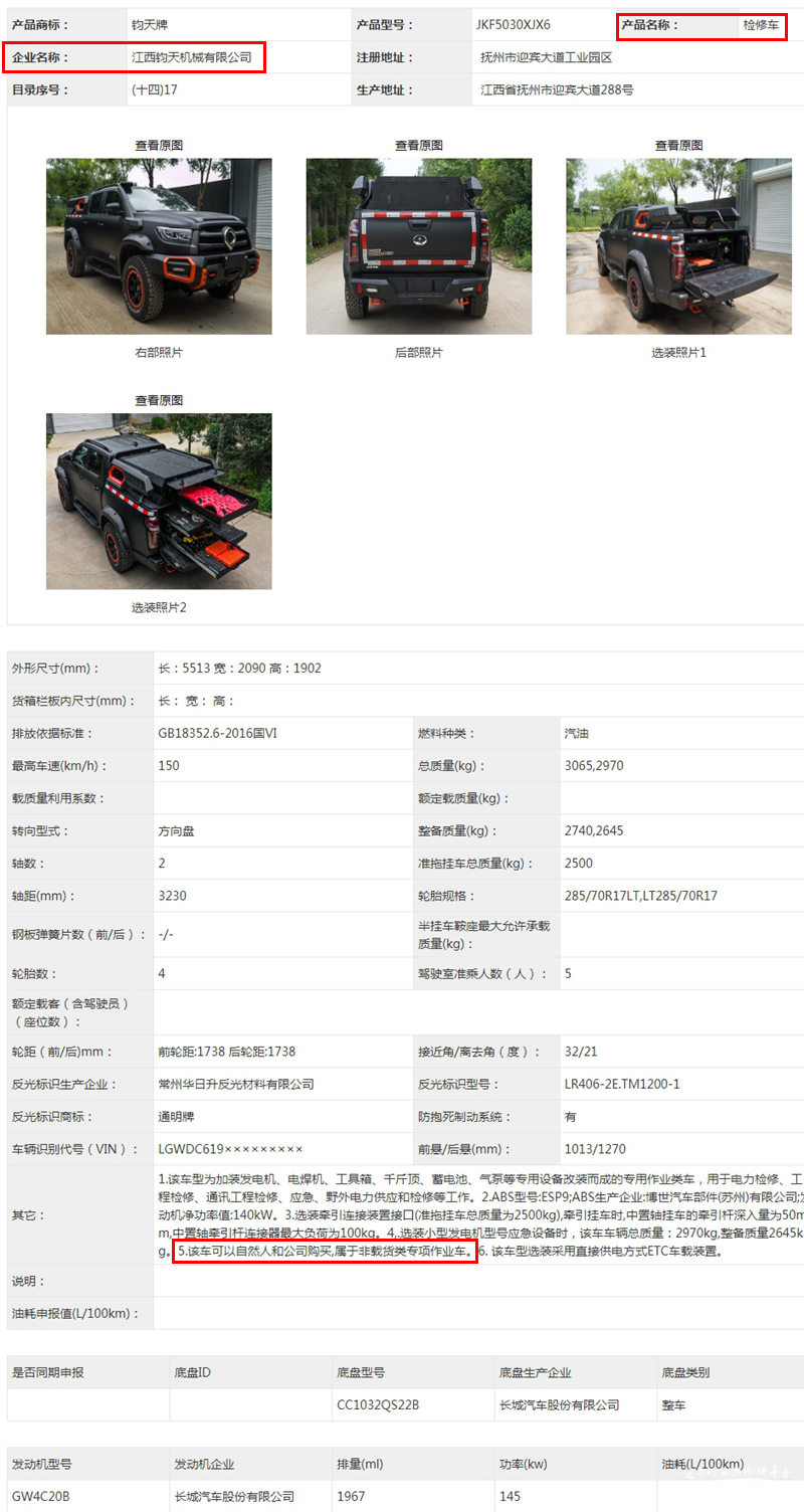 此次黑弹的申报公司为江西钧天机械有限公司,与上一次的长城厂家自己申报有所不同。而这款车的分类也被规定为检修车,意味着它是一台专用作业类车,属于非载货类专项作业车,拥有小专手续牌照(北京仍为一般皮卡手续),可以享受30年报废、节假日高速免费通行、6年新车免检政策(北京除外)等,另外还不受皮卡的禁限行限制。工信部申报信息的通过,证明该车可以上市进行售卖,预计将会很快交付到消费者手中。