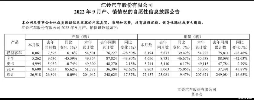 日前,江铃汽车公布了2022年9月的整体产销情况。公告显示,9月份,江铃汽车销售整车27457辆,同比增长9.47%;2022年1-9月江铃汽车累计销售整车207671辆,同比下降16.63%。