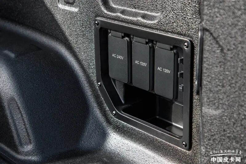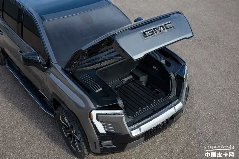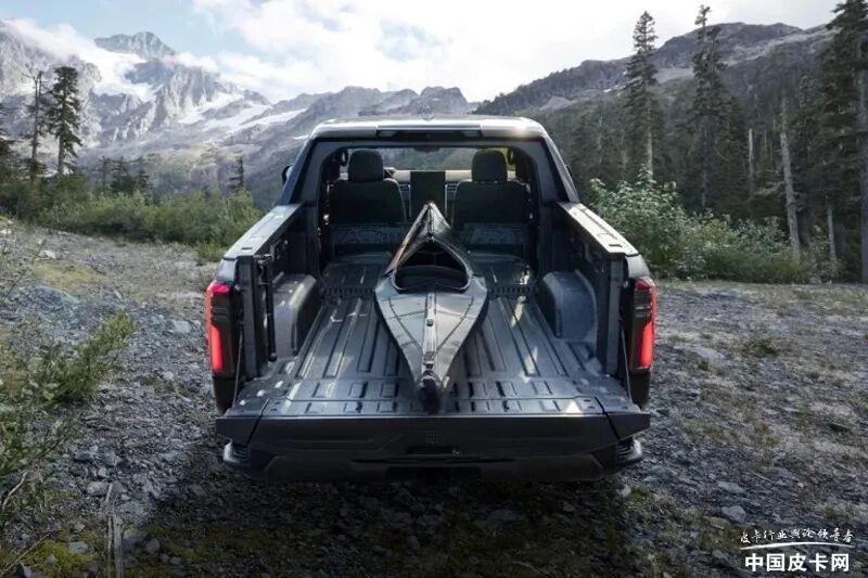 车身侧面是一副标准的皮卡造型,只不过由于纯电平台的使用,Sierra EV的货箱与座舱采用了一体式设计,而这样的好处就是让全车更具整体感,线条设计也更优雅一些,比如C柱采用运动型龙门架的样式,后轮轮拱的凸起向前部延伸的更多等等。Sierra EV乘员舱可与货舱完全打通,形成极为巨大的装载平台。