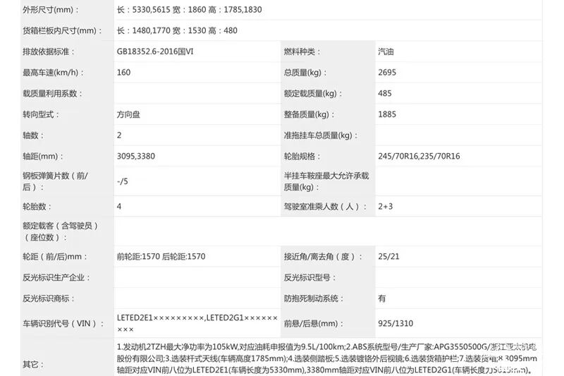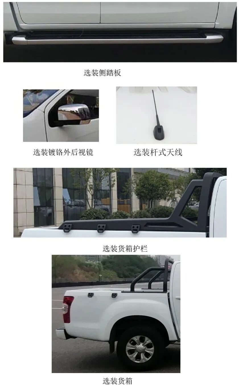 从申报信息来看,瑞迈车身尺寸为5330(5615)×1860×1785(1830)mm,货箱尺寸为1480(1770)×1530×480mm,轴距为3095(3380)mm。额定载质量485kg,轮胎规格为245/70 R16 235/70R16,接近角/离去角为25/21度。新车拥有丰富的选装配置,如装杆式天线、侧踏板、镀铬外后视镜、货箱、货箱护栏,ETC车载装置等。