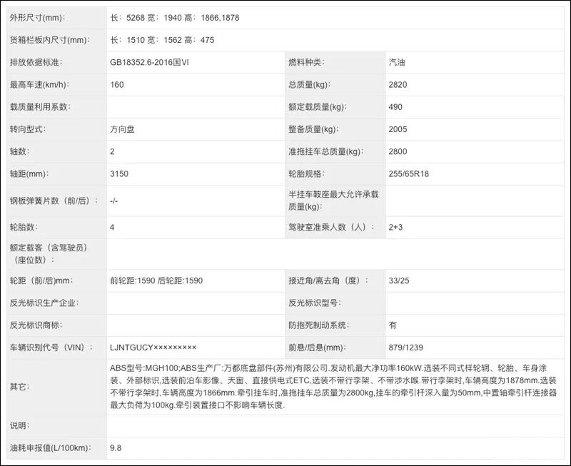 总体来说,锐骐7越野版的车身尺寸,因为有越野外观件的加入,相比常规锐骐7略大一些。车辆轴距没有改变,为3150mm。另外,车辆额定载质量为490公斤,并具有拖挂资质,最大拖挂质量2800公斤。