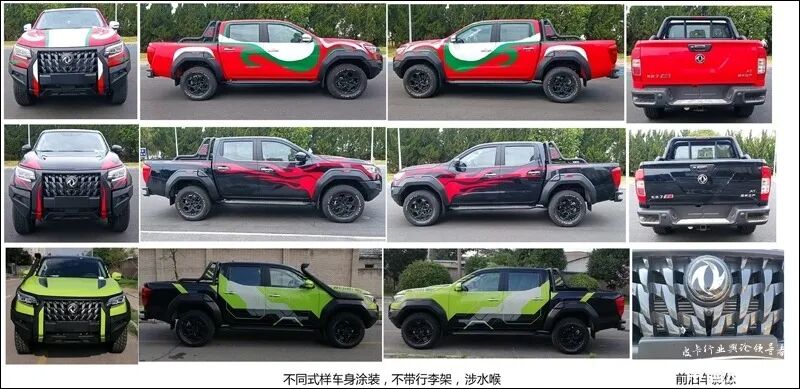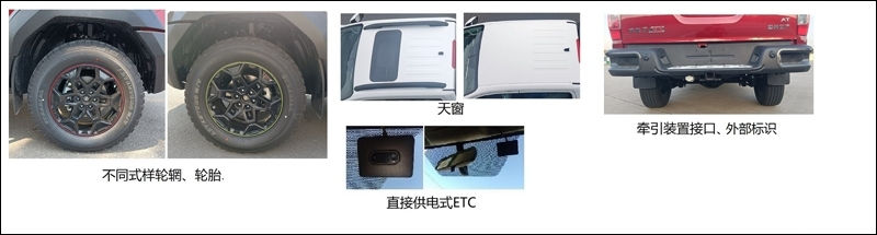 申报信息当中还涉及到不同的车身涂装,图片显示未来将会推出三种不同拉花风格。外部配置上也将提供有车头前部摄像头、天窗、龙门架。