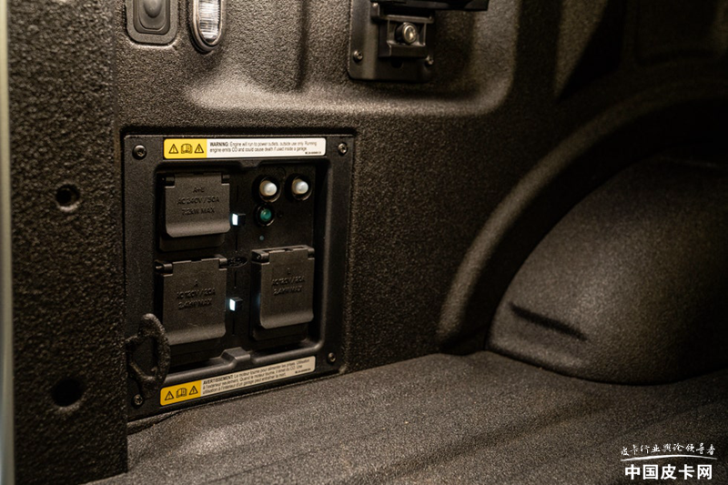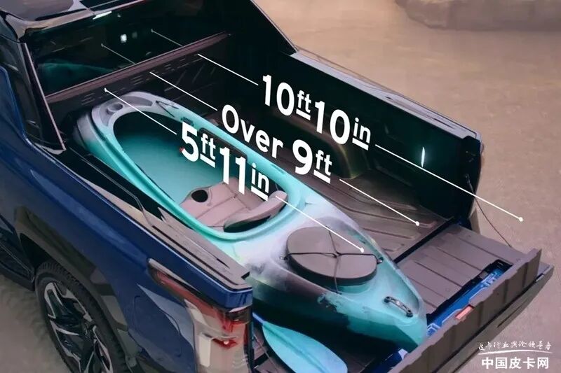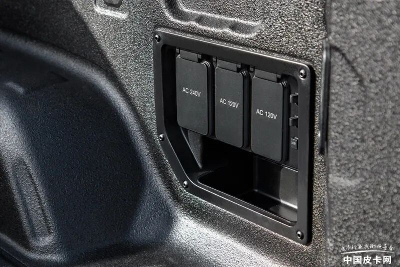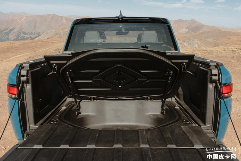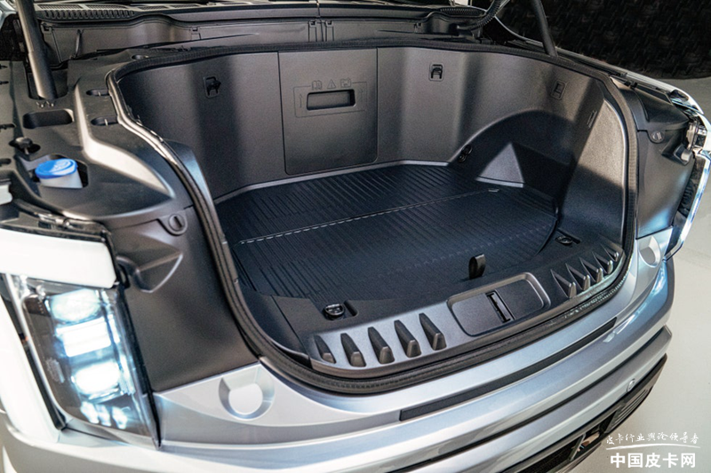 这款车也同样是一款来自美国新势力造车公司的产品,所以很多概念都与传统车企不同。当然,330升的前备箱尺寸也不小,但它并不能从保险杠处开启,只是一个“小盒子”。而储物空间方面有另外的特点可以补充这个不足,那就是它350升的贯通式侧货箱,这个空间在其他几款纯电皮卡上都没有,非常别出心裁。另外还有200升的货箱底部额外备胎空间,零零总总加在一起也能有不小的装载能力。货箱内部安装有三个110V电源插座,外放电功能也是特点之一。