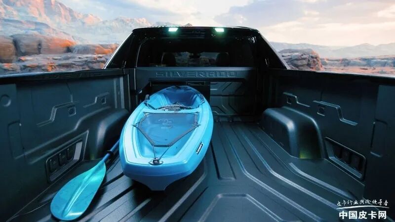 另外和很多电车一样,因为没有发动机,所以原本传统发动机舱被设计成了一个较大的储物空间。货箱部分也带有电动货厢盖以及通用的专利尾门,不仅可以电动开启,还支持多段开启,功能性极强。车辆底部还配备有多个摄像头,在驾驶过程中,信息娱乐显示屏和组合仪表中的越野部件会告知驾驶员车辆的扭矩输出、锁止差速器状态、轮胎压力、俯仰和滚转角、扭矩分配等信息。