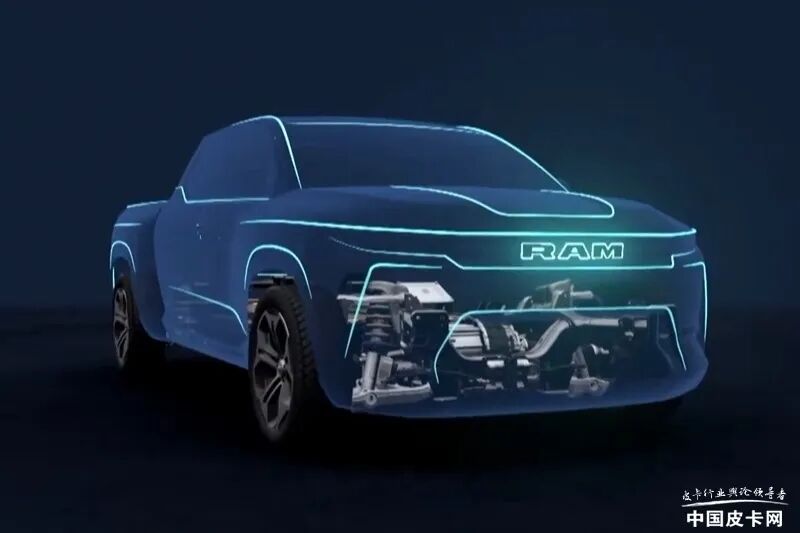 总结:说到结尾还想在延伸一下,作为美系皮卡巨头之一的道奇也在积极的推行电动皮卡产品,RAM 1500纯电动皮卡概念车将于2022年秋季正式亮相,量产版将于2024年正式投产。根据已有消息显示,这款车基于STLA平台非承载式底盘打造,续航里程可达805km,具备150kW快速充电功能。从底盘结构图来看该车将使用前双叉臂、后多连杆的形式,前后轴各带有一个电机,中部为巨大的电池空间,续航里程可达805km,具备150kW快速充电功能。