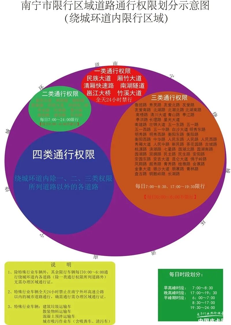 广西在今年下半年也有皮卡解禁的城市,但南宁仍然保持之前的要求没有改变。南宁市将限行区域道路通行权限进行了划分,也比较复杂,一类权限全天24小时禁行,二三类则是按时间段禁行。区域也面积较大,重点区域为绕城环道以内的道路,对皮卡用户来说影响也比较大。