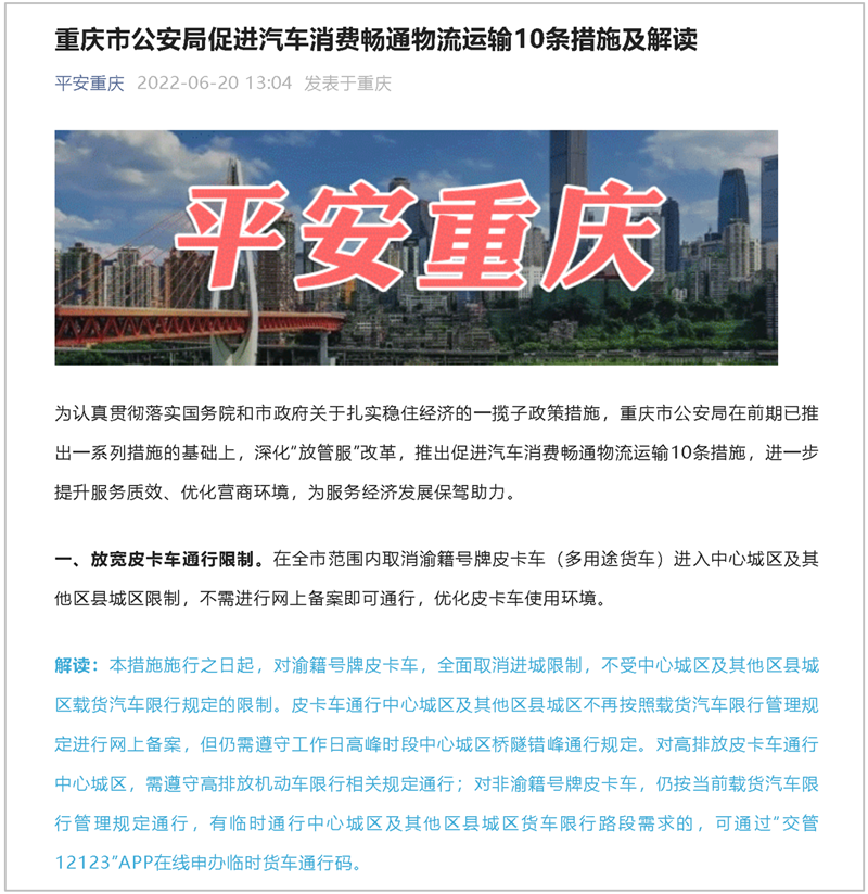 今年6月,重庆市公安局提出放宽皮卡车通行限制,具体为“在全市范围内取消渝籍号牌皮卡车(多用途货车)进入中心城区及其他区县城区限制,不需进行网上备案即可通行,优化皮卡车使用环境。”此外,对非渝籍号牌皮卡车,仍按当前载货汽车限行管理规定通行。这一要求对于重庆本地牌照皮卡来说基本上是全面解禁,而外地号牌皮卡仍然有禁行区域,但相对来说已经非常宽松了。