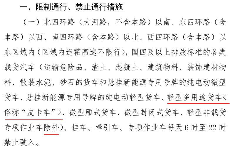 6月初,四川省政府发布通知,提出“研究进一步放宽皮卡车进城限制”,其中要求城区常住人口300万以下的城市全面取消皮卡车进城限制,城区常住人口300万以上的城市除特殊时段和特殊区域外取消皮卡车进城限制。但截止到今日,作为省会的成都依然没有出台相关具体措施,之前的要求都是针对所有货车车型的限制,所以皮卡也包含在内,例如: