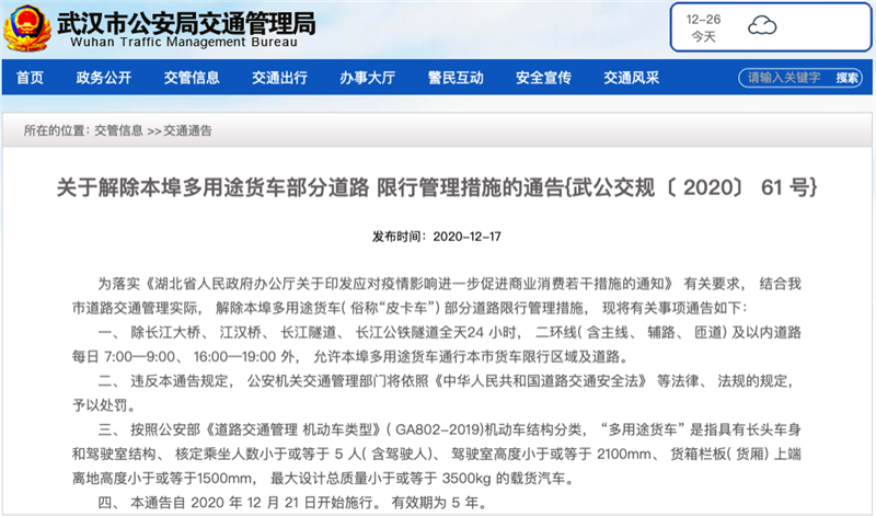 2020年12月,武汉交警发布了解除“武汉多用途货车部分道路限行管理措施公告”,除长江大桥、江汉桥、长江隧道、长江公铁隧道全天24小时,二环线(含主线、辅路、匝道)及以内道路每日7:00—9:00、16:00—19:00外,允许本埠多用途货车通行本市货车限行区域及道路。这一公告标志着武汉本地皮卡除了一些桥区和隧道,以及二环线以内分时段禁行外,其余时间和路段也几乎全面解禁。而对于外地牌照的皮卡或许会更严格一些。