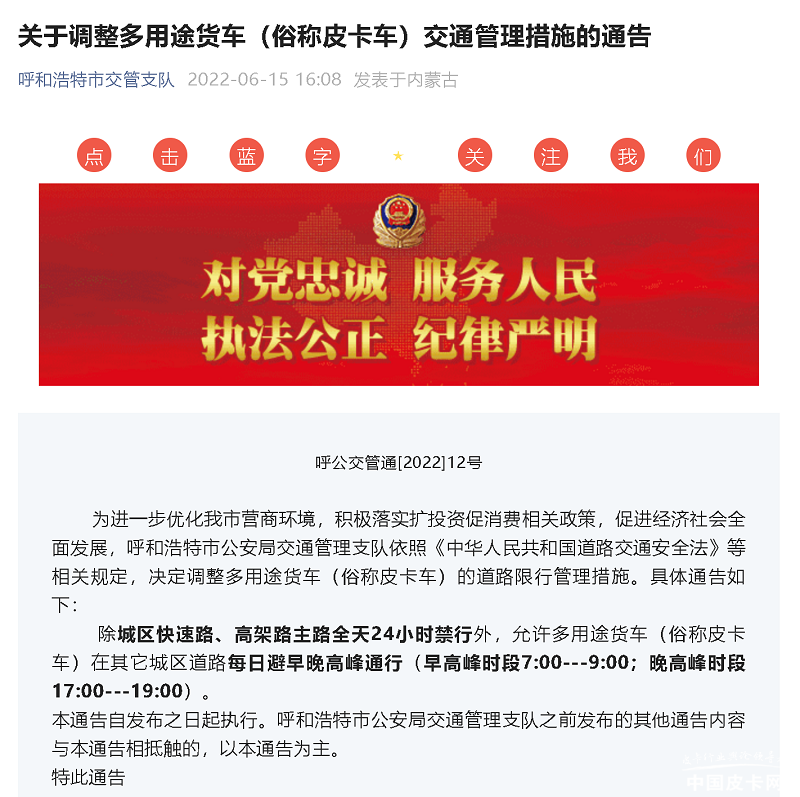 今年6月,呼和浩特市交管支队发布放宽皮卡车进城限制的通知:除城区快速路、高架路主路全天24小时禁行外,允许多用途货车(俗称皮卡车)在其它城区道路每日避早晚高峰通行(早高峰时段7:00-9:00;晚高峰时段17:00-19:00)。此通知也大幅放宽了皮卡在呼和浩特的可行区域,但时间上还是限制比较多。