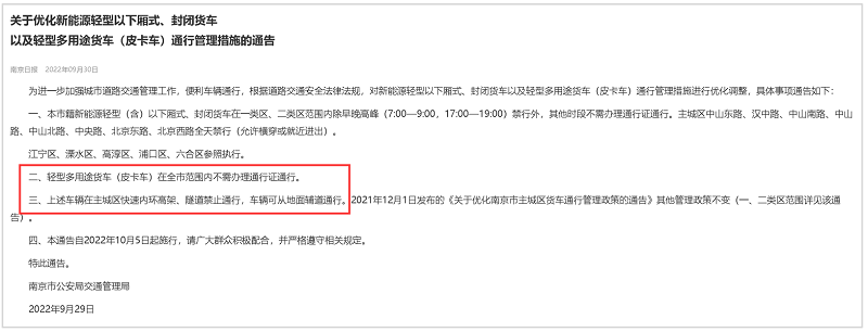 南京作为华东的一个重要城市,也在今年10月份提出了“轻型多用途货车(皮卡车)在全市范围内不需办理通行证通行”的规定,但是在快速内环高架、隧道则全天禁止通行。这样的措施也标志着南京几乎全面皮卡解禁,而这样一个准一线城市对皮卡解禁,是对皮卡进城一次最有力的宣传。