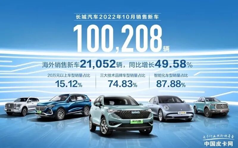 日前,长城公布了10月的销量数据。过去的10月,长城汽车销售新车100208辆,环比增长7.01%;海外销售21052辆,同比增长49.58%,创历史新高,销量占比21.01%;新能源车型销售10954辆;20万元以上车型销量占比15.12%。