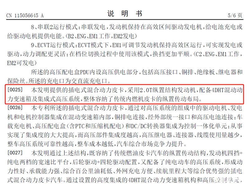从整体结构来看,这款插电混动皮卡依然会采用非承载式车身的架构,并且是纵置布局,与目前传统的燃油皮卡保持一致。整体的动力电池位于车架后部,支持交流和直流两种充电插口。动力部分自然是大家关注的问题,据公布资料显示,这个插电混动系统将会由2.0T发动机匹配4DHT混合动力变速箱所组成,变速箱主体内集成了发电机、驱动电机以及电机控制器。