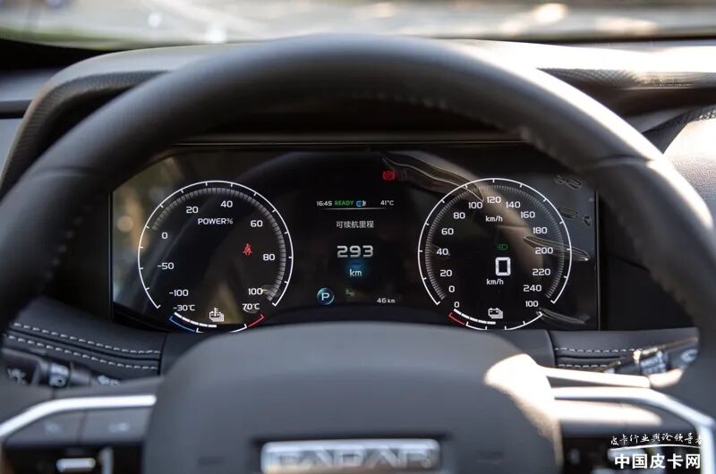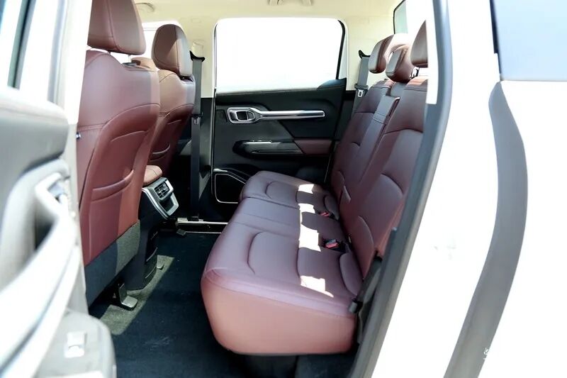 车辆内部当然也保持了乘用化的极致风格,家用氛围营造的非常不错。车内大量采用皮质包覆,并且多功能方向盘、两块12.3英寸屏幕的加入让整车的科技感和时尚感也恰到好处。另外中控屏自带的操作系统流畅度相当不错,集成了空调控制等,还带有语音控制、车联网等一系列衍生功能,实用性很强。9英寸全彩HUD以及12项L2+级智能驾驶辅助功能也是皮卡中非常少见的配置。