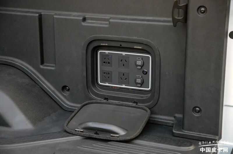 而且在这个货箱中还有大一亮点,那就是右侧的外放电功能。雷达RD6多功能放电面板支持16A、10A两种电流输出,三孔、双孔、12伏接口三种接口规格,最大支持6000w放电功率,可以说囊括了所有户外用电需求。除了放电面板支持外放电,在右侧的慢充接口处,雷达RD6还能像“手机充手机”一样进行车对车充电,以及同样可以延伸出外放电插口。可以说这款纯电动皮卡把外放电功能“玩”到了极致。